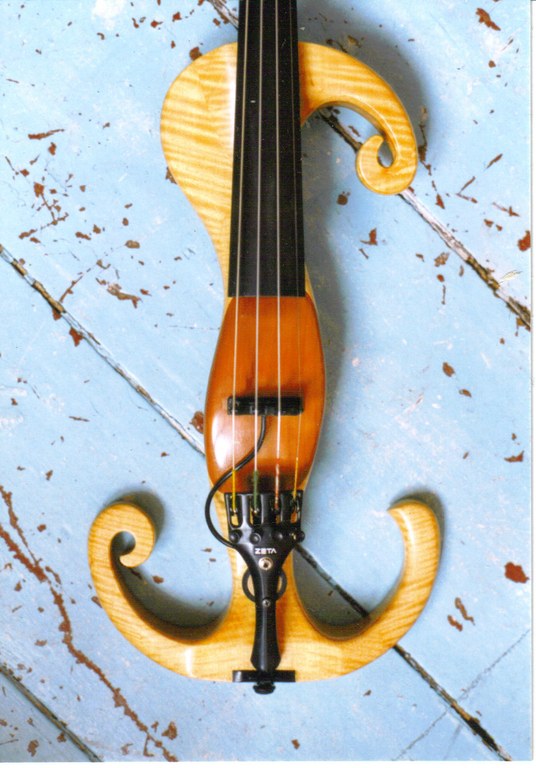 Unikat. Gebaut von Daniele Doglione und Peter Volkmer in Turin anno 2002. Ein Nachbau ist ausgeschlossen. Tonabnehmer von ZETA mit Volumenregler am Saitenhalter.